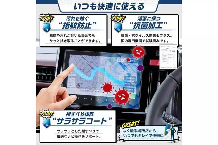 サラサラとした指滑りで快適にナビ操作ができ、指紋や汚れが付いた場合でもサッと拭き取ることができます。