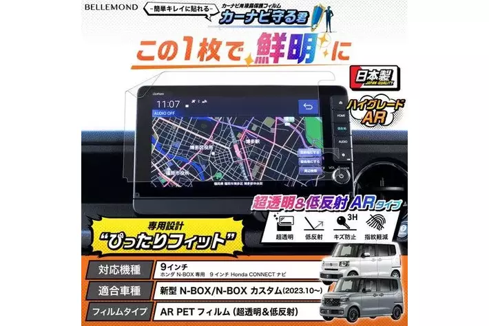 そんな悩みを解決するのが、BELLEMOND(ベルモンド)の『-簡単キレイに貼れる- カーナビ守る君 超透明&低反射 ARタイプ』。2024年3月に同シリーズから、ホンダ 新型N-BOX / 新型N-BOX カスタム (2023.10~) 9インチ Honda CONNECTナビ専用商品が発売されました。