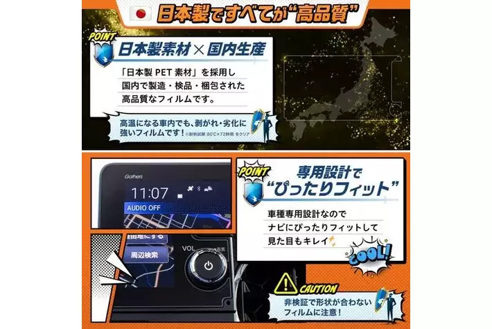 3分割保護シートにより、大きなナビ画面でも位置合わせが簡単。