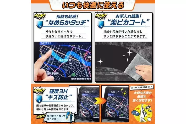 なめらかな指滑りで快適にナビ操作ができ、指紋や汚れが付いた場合でもサッと拭き取ることができます。