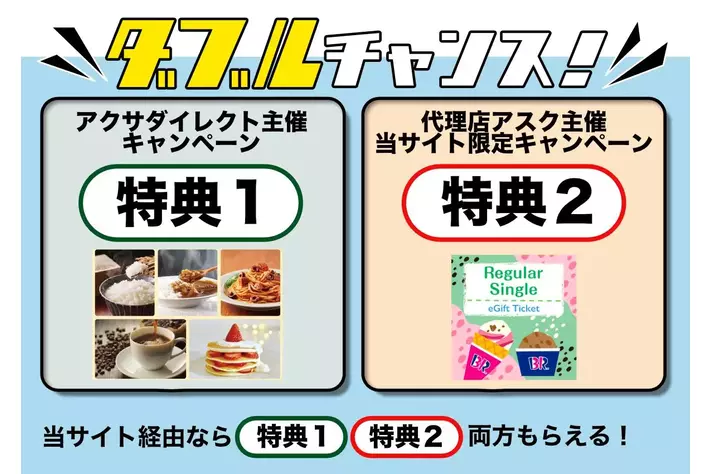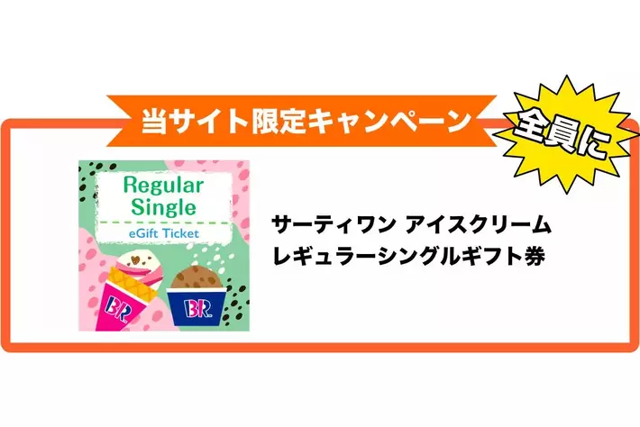 インターネットからの新規ご成約で「グルメギフト件1,000円相当」+「サーティワン アイスクリーム レギュ ラーシングルギフト券1枚」をもれなくプレゼントいたします。