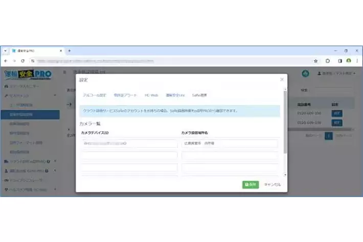 営業所情報の設定画面にSafie連携というタブが表示されますので、そちらにSafieのカメラのデバイスI Dを設定するだけです。