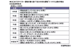 はじめてのマイカー運転を振り返り“自分の安全運転”につけた点数の理由をみると、【100点】では「事故を起こしていないから」「自信があるから」、【90点】では「特に事故もなく乗れていたから」「特に問題がなかったから」、【80点】では「スピードに注意したから」「交通ルールを守って運転したから」と、80点以上ではトラブルや事故を起こすことなく安全運転を実践できたことがうかがえる回答が多くなりました。【70点】では「慎重に走っていたが、上手ではなかったと思うから」「ある程度乗りこなしていたから」、【60点】では「思っていたより周りを見れていなかったから」「慎重になりすぎたから」、【50点】では「危ないと思ったことが何度かあったから」「ペーパードライバーだったから」、【40点】では「運転が荒かったから」「大きい車なので、怖かったから」、【30点以下】では「急ブレーキが多かったから」「運転に自信がなく、とても緊張してしまったから」と、60点以下では自分の運転を厳しく評価する回答が多くみられました。