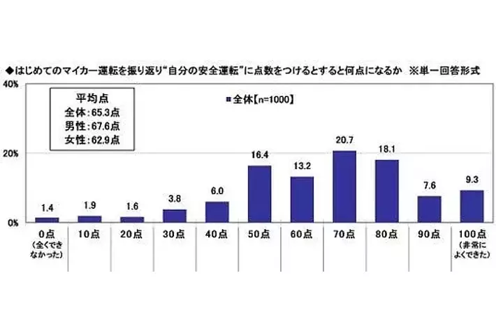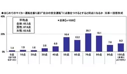次に、はじめてのマイカー運転を振り返り“自分の安全運転”に点数をつけるとすると何点になるか、0点(全くできなかった)~100点(非常によくできた)として、あてはまる点数を聞いたところ、「50点」(16.4%)や「70点」(20.7%)、「80点」(18.1%)などに回答が分かれ、平均点は65.3点と、はじめてのマイカー運転前における安全運転の自信度(平均61.6点)と比べて3.7点高くなりました。