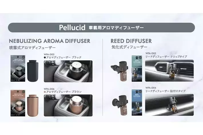 運転シーンを想定した15種類の香りのエッセンシャルオイルは、製品の開発から空間プロデュースまで「香り」のトータルサービスを提供する@aroma社に製造を委託。2種類の車載用ディフューザーも同時発売し、車内をワンランク上の香り空間に演出します。