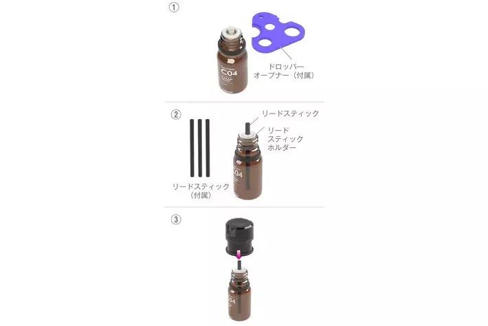 付属のリードスティックを直接エッセンシャルオイルの瓶に差し込むとリードスティックがエッセンシャルオイルを吸い上げ、車内に心地良い香りを広げます。※エッセンシャルオイルは別売りです。