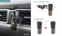 エアコン吹出し口にクリップを挟むだけのクリップタイプと車両内装に粘着テープで貼付ける、貼付けタイプの2種ご用意。ボールジョイントでボトルの角度調整や、トップカバーの開閉で、香りの強弱を調整する事もできます。どちらもボトルごと本体が外せるので、お部屋での使用も可能です。