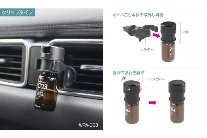 エッセンシャルオイル(同時発売:別売り)の瓶をそのまま取り付けて使用できるので設置も簡単。エアコンの風で心地よく香りが車内に広がるクリップタイプと、設置する場所を選ばない貼付けタイプの2種をご用意。