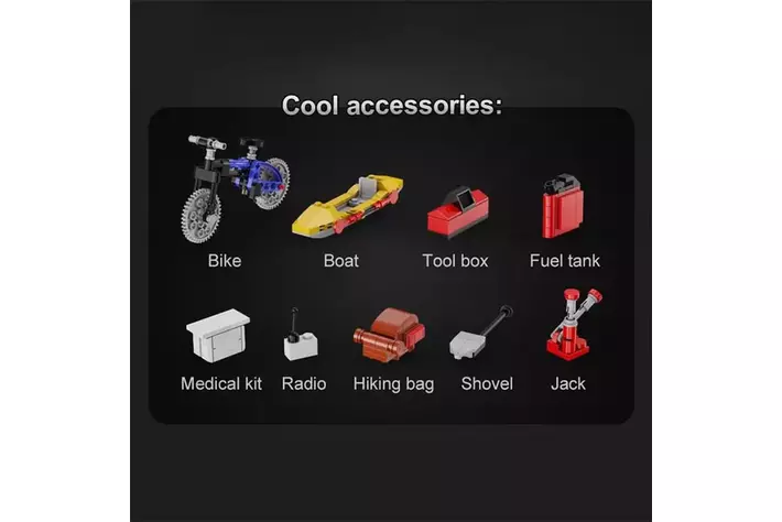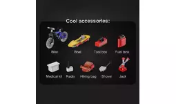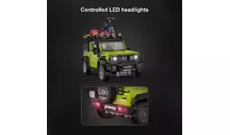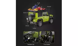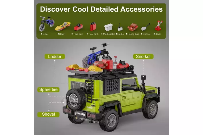 1/12というスケールでは、バンパーやライトなど細部のディティールをブロックで再現し、ややゴツゴツしたフォルムで、ルーフを飾るバイクやツールボックスやショベルなどのミニチュアパーツブロックも付属し、エンジンルームも再現。ジムニーファンにはたまらない遊び心溢れる一台となっております。