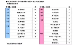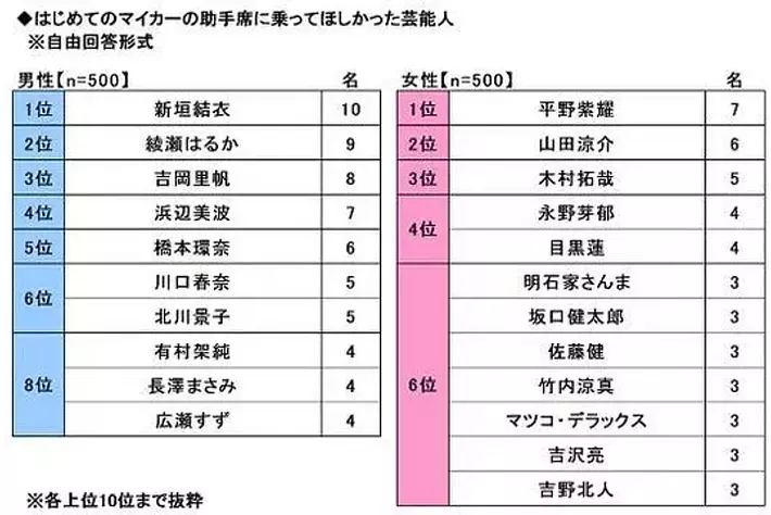 全回答者1,000名に、はじめてのマイカーの助手席に乗ってほしかった芸能人を聞いたところ、男性回答では1位「新垣結衣さん」(10名)、2位「綾瀬はるかさん」(9名)、3位「吉岡里帆さん」(8名)、4位「浜辺美波さん」(7名)、5位「橋本環奈さん」(6名)、女性回答では1位「平野紫耀さん」(7名)、2位「山田涼介さん」(6名)、3位「木村拓哉さん」(5名)、4位「永野芽郁さん」「目黒蓮さん」(いずれも4名)となりました。