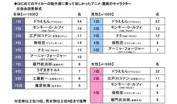 男女別にみると、男性回答、女性回答とも1位は「ドラえもん(ドラえもん)」(男性回答22名、女性回答32名)でした。男性回答では2位「モンキー・D・ルフィ(ONE PIECE)」(13名)、3位「ナミ(ONE PIECE)」(12名)、4位「孫悟空(ドラゴンボール)」(8名)、5位「アーニャ・フォージャー(SPY×FAMILY)」(7名)、女性回答では2位「江戸川コナン(名探偵コナン)」(11名)、3位「モンキー・D・ルフィ(ONE PIECE)」「孫悟空(ドラゴンボール)」「竈門炭治郎(鬼滅の刃)」(いずれも6名)となりました。
