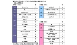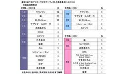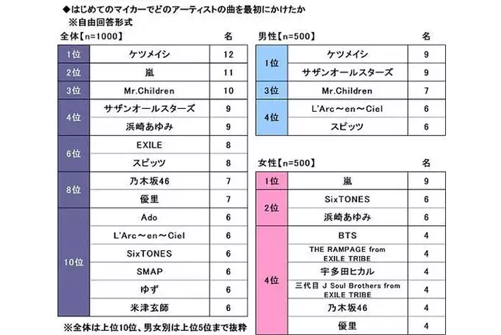 男女別にみると、男性回答では1位「ケツメイシ」「サザンオールスターズ」(いずれも9名)、3位「Mr.Children」(7名)、4位「L'Arc~en~Ciel」「スピッツ」(いずれも6名)、女性回答では1位「嵐」(9名)、2位「SixTONES」「浜崎あゆみ」(いずれも6名)、4位「BTS」「THE RAMPAGE from EXILE TRIBE」「宇多田ヒカル」「三代目 J Soul Brothers from EXILE TRIBE」「乃木坂46」「優里」(いずれも4名)となりました。