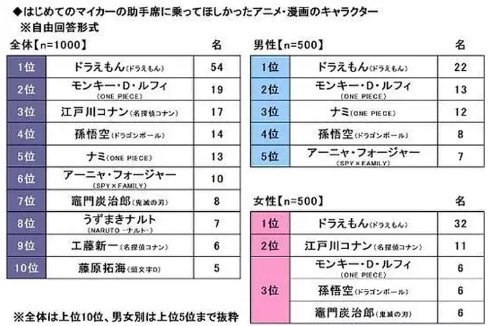 また、はじめてのマイカーの助手席に乗ってほしかったアニメ・漫画のキャラクターを聞いたところ、1位「ドラえもん(ドラえもん)」(54名)、2位「モンキー・D・ルフィ(ONE PIECE)」(19名)、3位「江戸川コナン(名探偵コナン)」(17名)、4位「孫悟空(ドラゴンボール)」(14名)、5位「ナミ(ONE PIECE)」(13名)となりました。