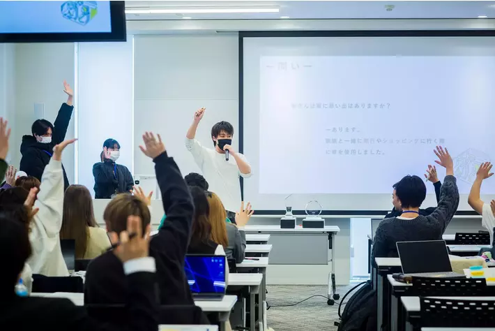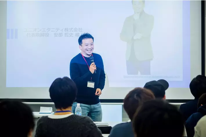 マ」、車陸送サービス「車陸送.com」、総合自動車サービス「mobiful」など自動車に関わる様々なサービスを展開するユニオンエタニティ株式会社(大阪府大阪市、以下「ユニオンエタニティ」)の代表取締役 安部哲史氏(写真)、取締役 角田裕典氏が講師として参加。日頃、大学で人を幸せにするビジネスデザインを学んでいる新2年生・新3年生のZ世代の学生たち29名が実際のビジネスを肌で感じながら、人とのつながりを大切に成長し続けていくことを企業理念とするユニオンエタニティの新しいカーアイテムを創造するプロジェクトで、2月28日のキックオフから3週間、全6回の授業を通して取り組みました。