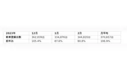 2024年2月の新車登録台数は前月比103.0%、中古車登録台数は前月比119.7%となりました。過去2年間の推移を見ても、2月は新車・中古車ともに登録台数が増加傾向になっており例年通りの動きを見せております。