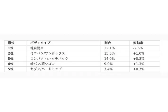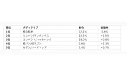 国産車のボディタイプ別ランキングでは、軽自動車が1位となりました。軽自動車はシェアを落としており、他ボディタイプが全体的にシェアを伸ばしています。
