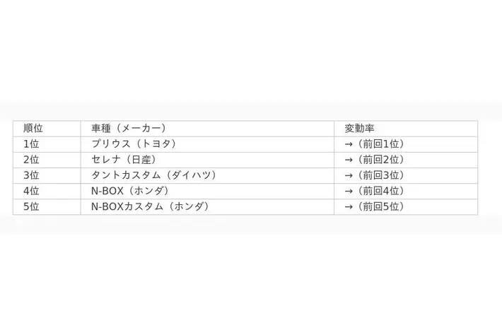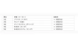 国産車の車種別ランキングではプリウス(トヨタ)が1位となりました。プリウス(トヨタ)とセレナ(日産)は4ヶ月連続でランキング1位、2位をキープしています。1位~5位までに変動はなく、人気が集中していることがわかります。