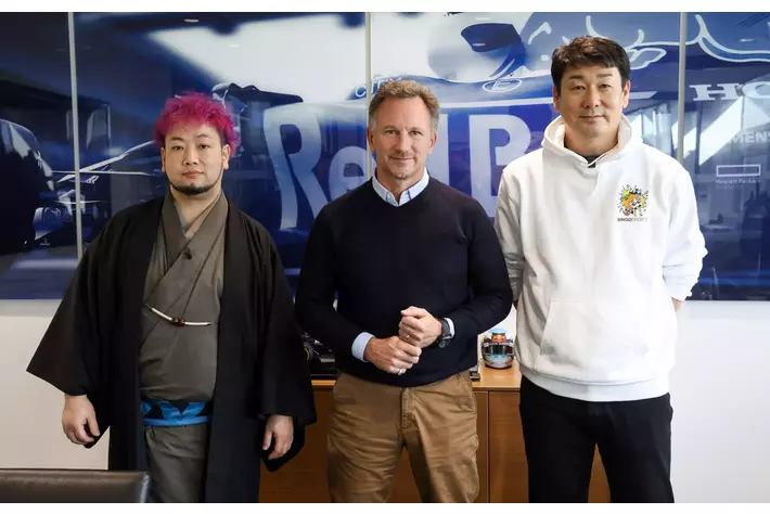 チーム代表のクリスチャン・ホーナーとアーティスト池内氏、そしてBINGO 代表武井氏
