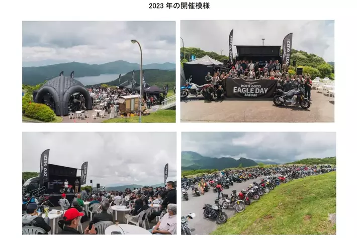 MOTO GUZZI EAGLE DAY は、イタリア最古のモーターサイクルブランドである MOTO GUZZI の世界観 や楽しさを共有する場として、新旧様々なグッツィオーナーやファンの皆様が気軽に集うイベントで、昨年に 引き続き、ツーリングの人気スポットである箱根にて実施いたします。 このイベントを通じてさらに MOTO GUZZI ブランドを深く知っていただくためのコンテンツとして、試乗会、 グッズ販売、V7IIIオーナーでもあるタレントの平嶋夏海さんをゲストに迎えたトークショーの他、GUZZI カフ ェをオープンします。MOTO GUZZI オーナーはもちろん、オーナー以外の方や車でのご参加も可能ですの で、お気軽にご来場ください。メディア関係者様のご参加もお待ち申し上げます。