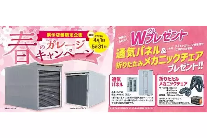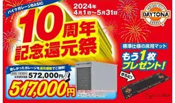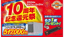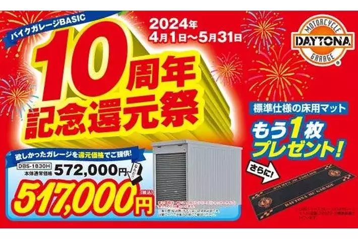 オートバイアフターパーツメーカーの株式会社デイトナ(静岡県周智郡森町一宮4805 代表取締役 織田哲司)は、バイク専用ガレージ「デイトナモーターサイクルガレージ 」発売10周年を記念し、2024年4月1日~5月31日の期間限定で、2つのキャンペーンを同時に開催いたします。