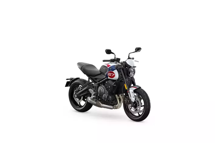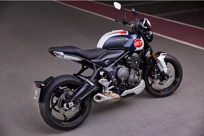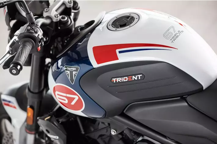 2024年の新型となるこの「Trident Triple Tribute」は3気筒エンジンを活かしたモデルで、今期の限定販売となります。このネイキッドロードスターは、トライアンフらしい「ホワイト、ブルー、レッド」カラーのレーシングスキームを現代風にアレンジしただけでなく、「Slippery Sam」を彷彿とさせる、特徴的な67番のグラフィックを採用しています。