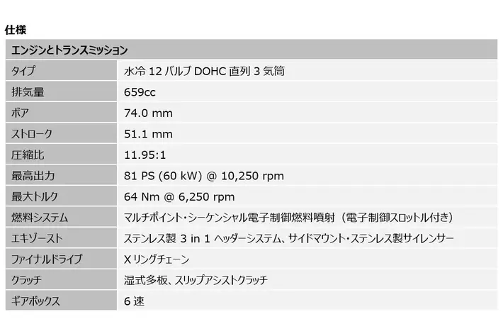 Trident専用にチューニングがされた660ccの3気筒エンジンは、ミドルウェイトでのスポーツネイキッドカテゴリーにおいて、ローダウンでのトルク、ミッドレンジ、トップエンドでのパワーを完璧なバランスで提供します。