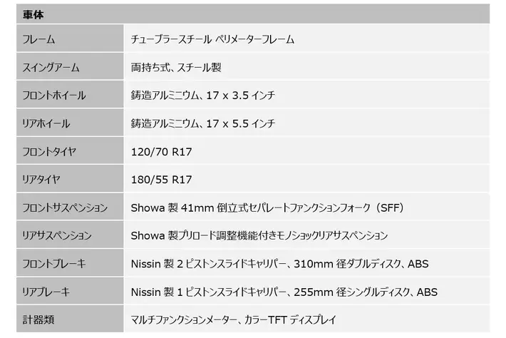 ブレーキは優れた制動力を発揮する、Nissin製2ピストンブレーキと310mm径ツインディスク、Michelin製ロード5タイヤを装備し、どんな天候や路面でも安心して走行することが可能です。