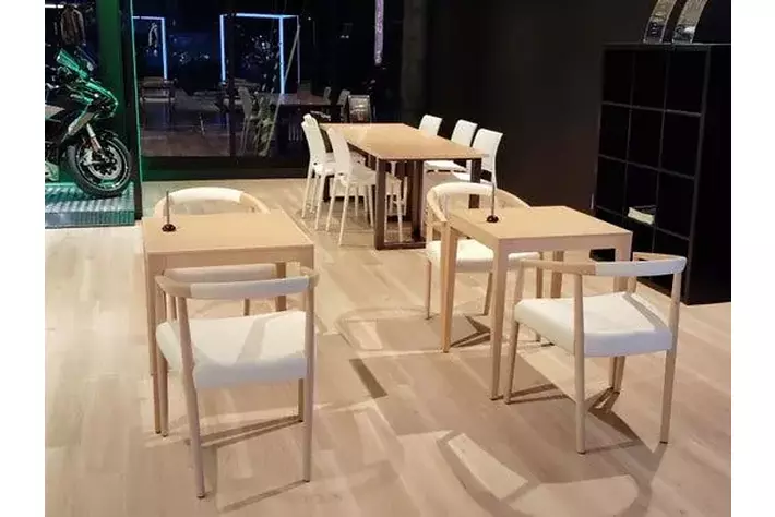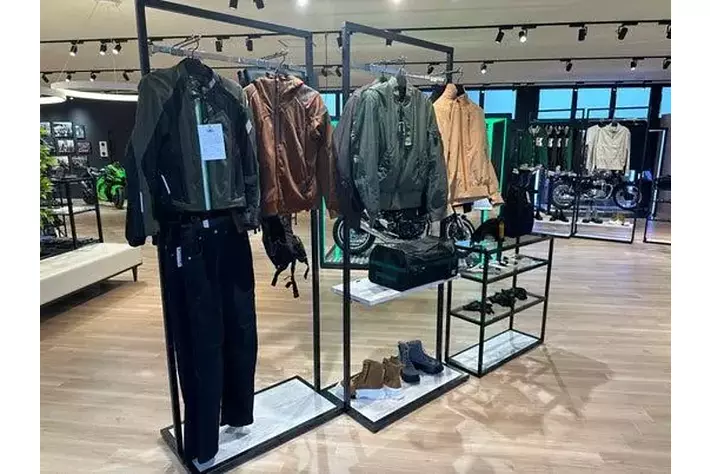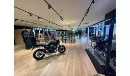 木目調のフロアと白い天井が織りなす明るい店内。モーターサイクルとプラザアパレルがゆったりと展示され、どなたでも楽しめる空間となっています。