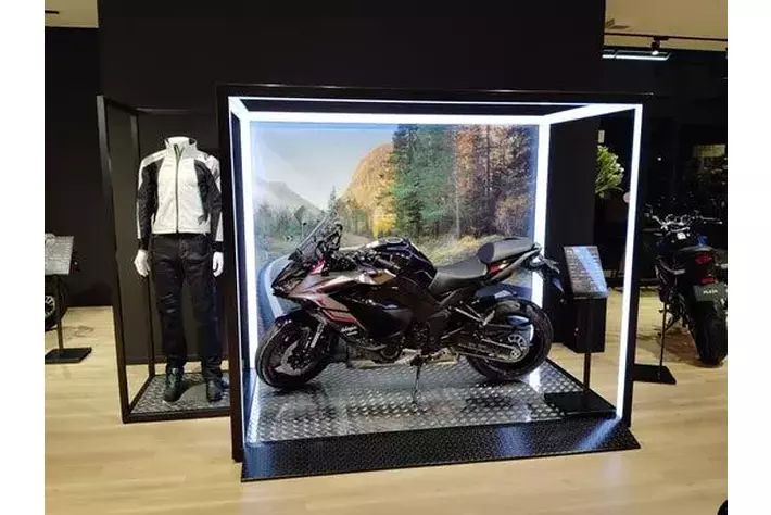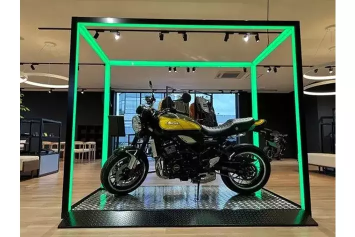 新たなオーナーを待つモーターサイクルたちが、ケージの中で静かに眠りについているイメージを光の枠で創出。カワサキ プラザならではのアイコニックポイントの一つです。