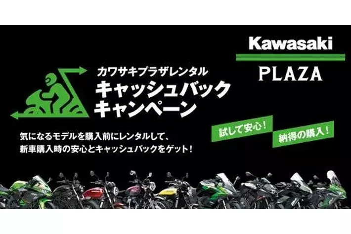 株式会社カワサキモータースジャパン(本社:兵庫県明石市、代表取締役社長:桐野 英子)が展開するカワサキプラザネットワークでは、期間中カワサキプラザレンタルをご利用の上、同一モデルシリーズをご成約のお客様へレンタル料金をキャッシュバックする「カワサキプラザレンタル キャッシュバックキャンペーン」を4月1日より実施いたします。