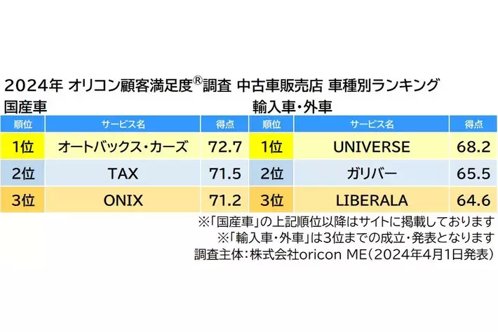実際のサービス利用者を対象に第三者の立場で顧客満足度調査を実施する株式会社oricon ME(本社:東京都港区 代表取締役社長:小池 恒 略称:オリコン)は、『中古車販売店』の満足度調査を実施し、2024年4月1日(月)14時にその結果を「オリコン顧客満足度(R)」公式サイト内( https://life.oricon.co.jp/ )にて発表いたしました。