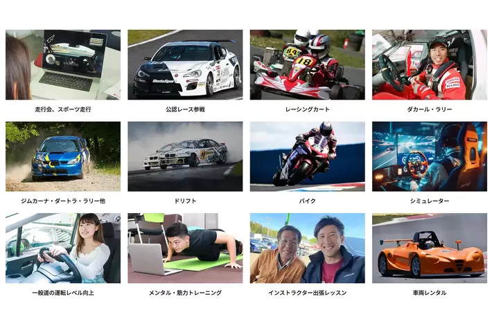 走行会、公認レース、レーシングカート、ダカール・ラリー、ジムカーナ・ダートラ・ラリー等各種スピード競技、バイク(オン/オフロード)、ドリフト、シミュレーター、一般道の運転レベル向上、メンタル及び筋力トレーニング(競技者向け)