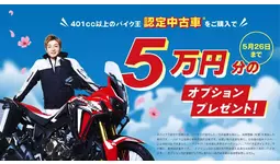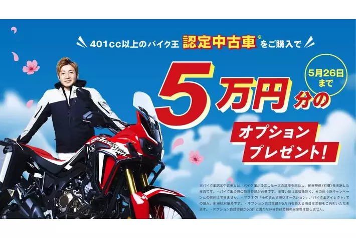 401cc以上のバイク王認定中古車を購入で50,000円分のオプションプレゼント!春の大型バイクデビュー応援