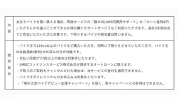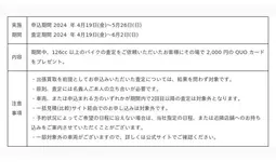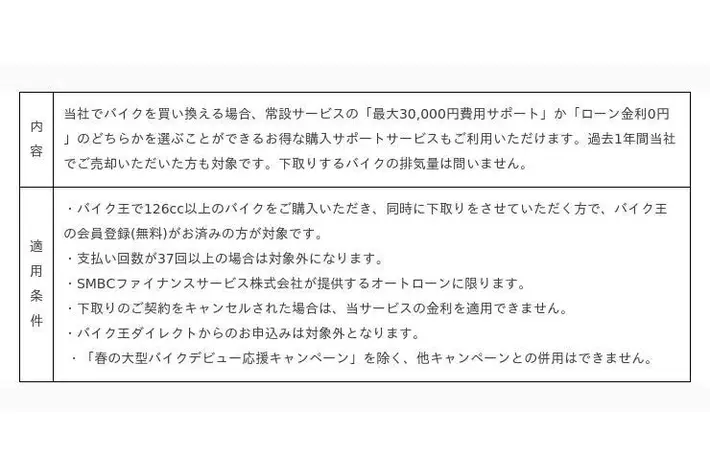 「まだ世界にない、感動をつくる。」をコーポレートミッションに掲げ、ビジョンである「バイクライフの生涯パートナー」の実現に向けて、事業を展開する株式会社バイク王&カンパニー(代表取締役社長執行役員:石川秋彦、本社:東京都世田谷区、証券コード:3377、以下「当社」)は、4月19日(金)より買取のキャンペーン「査定するだけ!もれなくもらえる2,000円キャンペーン」(以下、当買取キャンペーン)と販売のキャンペーン「401cc以上のバイク王認定中古車を購入で50,000円分のオプションプレゼント!春の大型バイクデビュー応援キャンペーン」(以下、当販売キャンペーン)の2つのキャンペーンを開始いたします。