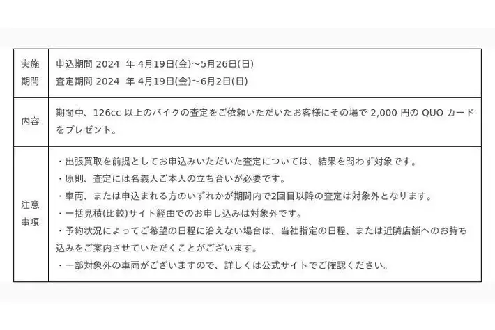 「しばらく乗っていないバイクが家にある」「他のバイクへ乗り換えを検討している」といった方を後押しさせていただきたく、当買取キャンペーンを実施する運びとなりました。当買取キャンペーンでは、期間中に126cc以上のバイクを査定いただいた方を対象に、2,000円分のQUOカードをその場でプレゼントいたします。手放しや買い換えをご検討の方は、この機会にぜひご利用ください。