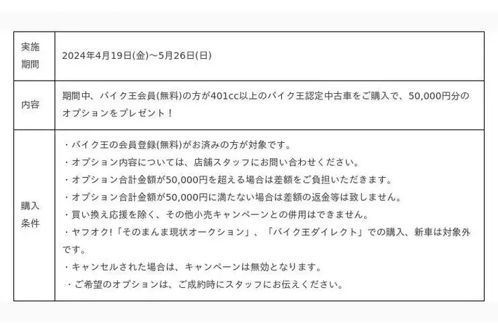 「大型バイクに憧れがある」「大型バイクに興味はあるけどきっかけが…」と多くのライダーよりお声をいただいていた背景から、この春のバイクシーズンに大型バイクへのデビューや買い換えをご検討の方を後押しさせていただきたいという想いで当販売キャンペーンを実施する運びとなりました。期間中にバイク王の店舗で401cc以上のバイク王認定中古車をご購入いただくと、50,000円分のオプションをプレゼントいたします。10万台以上の年間取扱台数を誇るバイク王では大型バイクも多数ご用意しております。この機会にお好みの車両を見つけてみませんか?