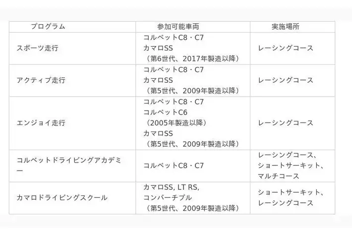 第5回となる今年も多彩なプログラムをご用意。ハイパフォーマンンス・スポーツカー「シボレー コルベット」のドライビングアカデミーを開催するほか、レーシングコースでのスポーツ走行やアクティブ走行など、レベルに分けての各種有料走行プログラムを設定しています。