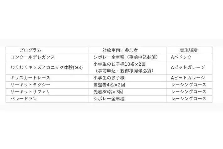 運転する楽しみだけでなく、さまざまな楽しいクルマ体験ができるのもこのイベントの魅力。抽選でレーシングドライバーの助手席でサーキット走行を体感するサーキットタクシーや、マイクロバスでレーシングコースを見学するサーキットサファリ、歴代の名車も登場し自慢のシボレーを競うコンクールデレガンス、子どもたちのクルマへの興味を育てるわくわくキッズメカニック体験などを実施します。