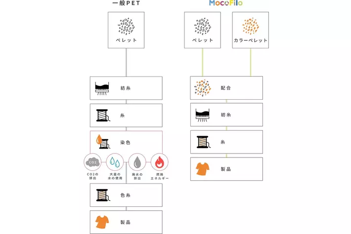 MocoFilo(R)はポリエステル原着糸で、水使用量やCO² 排出量、燃焼エネルギーを大幅に削減し、紡糸段階で着色されているため、染色工程を必要としない環境に優しい工程で製造されています。染色生地とMocoFiloを使用した生地を比較すると、水の使用量は約66%削減することができ、CO2排出量も約70%削減することが可能です。