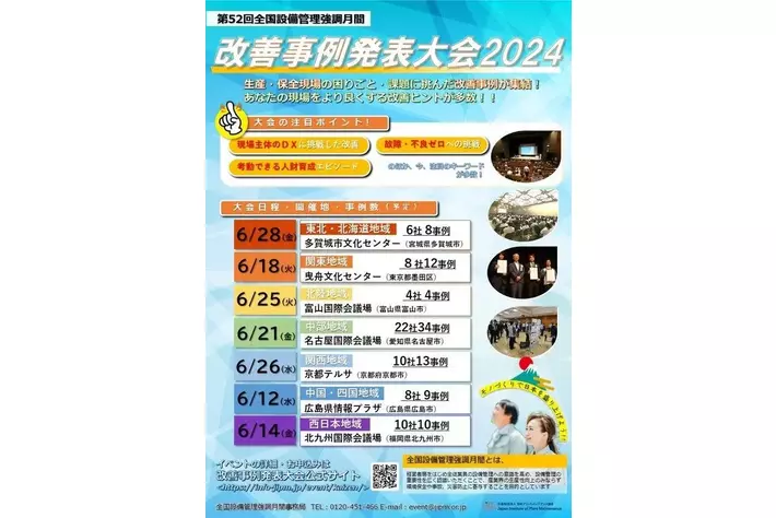 この大会では、製造現場や製造過程での安全性、効率性、品質、コストなどを改善した活動を発表し、参加企業の設備管理意識を高めることを目的としています。今年度は全国7地域で68社・90事例の活動が発表される予定です。詳細は、公式サイトをご確認ください。