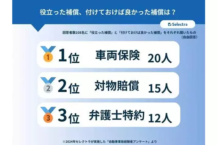役立った補償・付けておけば良かった補償は、1位:車両保険、2位:対物賠償、3位:弁護士特約