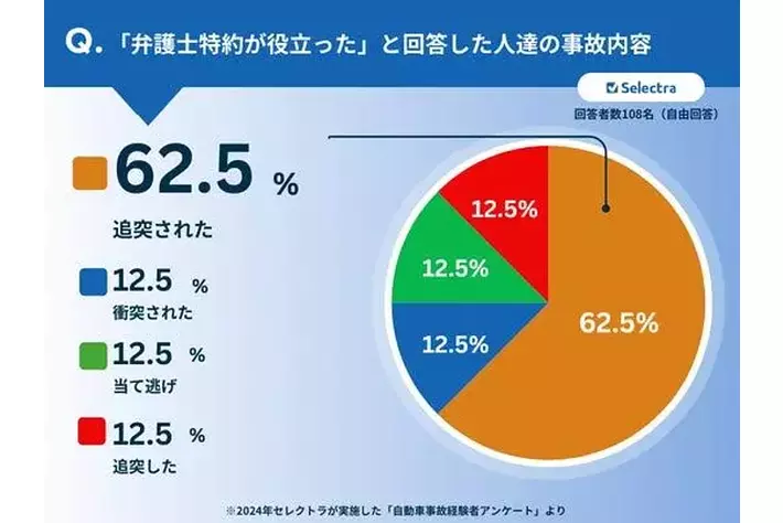 今回の事故経験者アンケートでは、弁護士特約を使った人が108人中14人おり、そのうち10人が「役立った補償」と回答している満足度の高い補償と言えます。