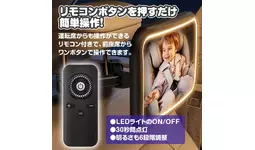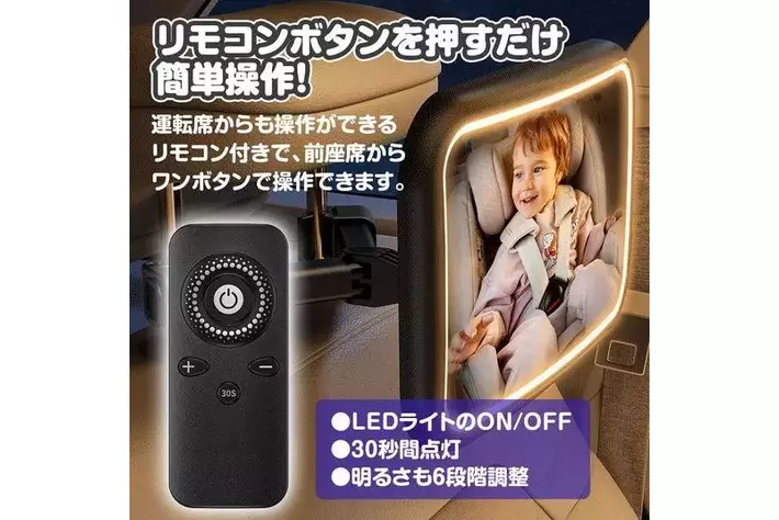 運転席からも操作ができるリモコン付きで、前座席からワンボタンでLEDライトのON/OFFや、30秒間点灯させることが可能。さらにライトの明るさも6段階調整することができます。ミラー本体裏の電源ボタンでも操作可能です。