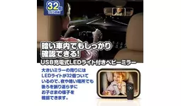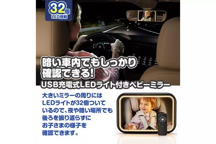 大きいミラーの周りにはLEDライトが32個ついているので、夜や暗い場所でも後ろを振り返らずにお子さまの様子を確認できます。