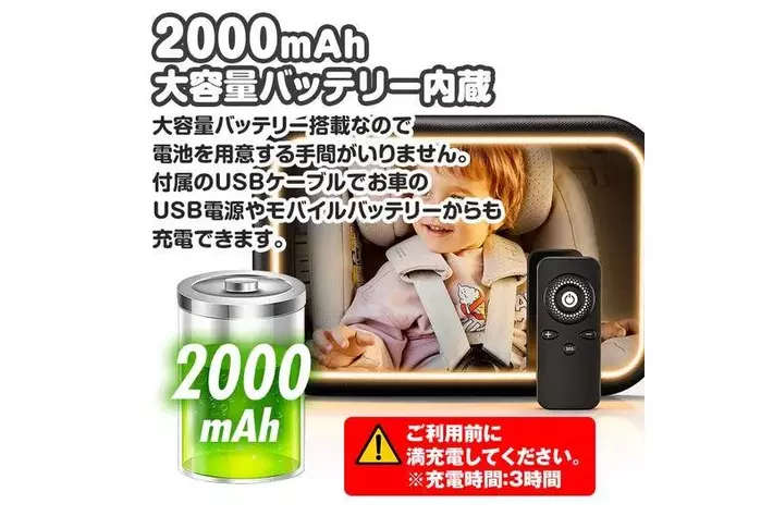 大容量バッテリー搭載なので電池を用意する手間がいりません。付属のUSBケーブルでお車のUSB電源やモバイルバッテリーからも充電ができます。