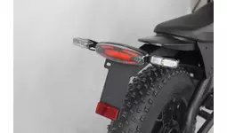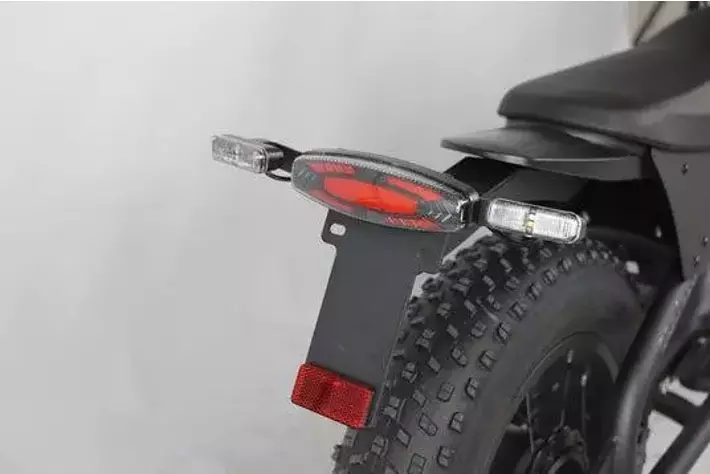 後方には、ウィンカーとブレーキライト付きリアライトを装備しています。夜道に車道を走る際も安心です。 速度表示灯(緑ランプ)とナンバー取り付けプレート、後方反射板も装備しています。