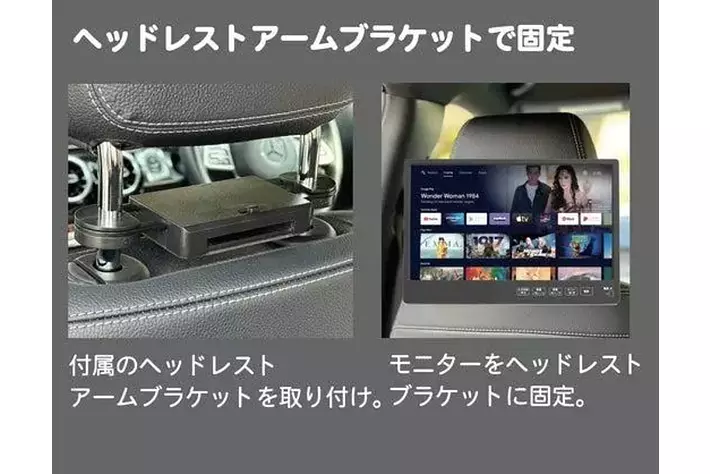 Wi-Fi環境設定で車の後部座席やご家庭等で配信サービスが見られ、大画面モニターを車の後部座席のヘッドレストに付属ブラケットでしっかりと固定もでき、あたかもリビングにいるようなくつろぎ感を演出します。