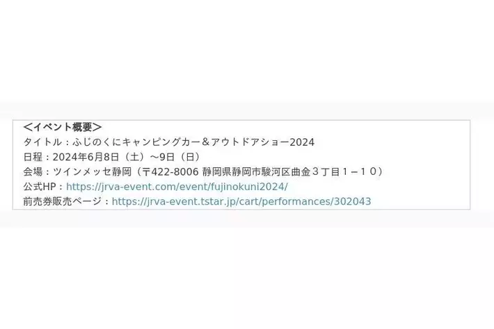 ふじのくにキャンピングカー&アウトドアショー実行委員会(事務局:株式会社ネオプロジェクト)は、2024年6月8日(土)~9日(日)に開催される「ふじのくにキャンピングカー&アウトドアショー2024」のステージ出演者&タイムテーブルを公開いたします。報道関係者の皆様におかれましては、ぜひご掲載・お問い合わせのほど、宜しくお願い申し上げます。