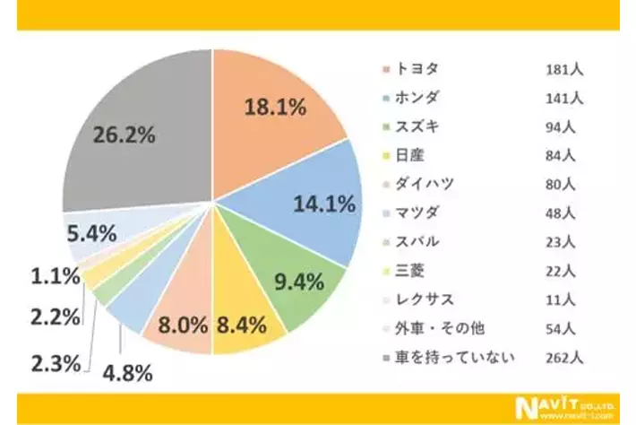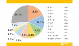 使用している車のメーカーについては「トヨタ」で18.1%と最も多かったです。続いて「ホンダ」で14.1%、「スズキ」で9.4%となりました。全体の約半数がこの3社が占めている結果が出ました。
