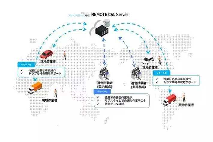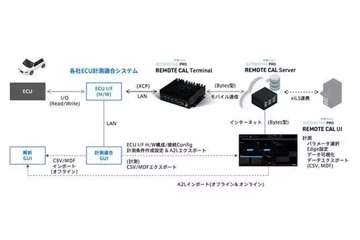 REMOTE CAL は車両開発における車両ECU計測試験のリモート化を実現するソリューションパッケージで、車両開発現場におけるデータ計測業務を遠隔化することでシステム評価や部品評価などの開発プロセスを効率化します。オープンインターフェースASAM MCD-1 XCP (XCP on Ethernet) への対応により、既存の計測適合ツールとの連携、HILS連携により、フリート計測現場と開発現場をリモートネットワークで直結することで、現場に機動力と効率化をもたらし、開発工程の大幅な時間短縮とコスト削減を実現します。